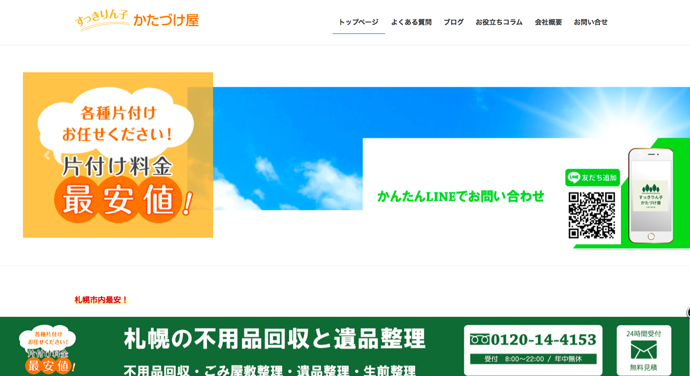 | すっきりん子かたづけ屋 | 見積りをしなければわからない | 遺品整理士や生前整理士の資格を持っている方がいる | 受付時間:8:00〜23:00 | 札幌のみ | 不用品回収、遺品整理、ゴミ屋敷清掃、高価買取 | 遺品供養の記載はありませんでした。 |