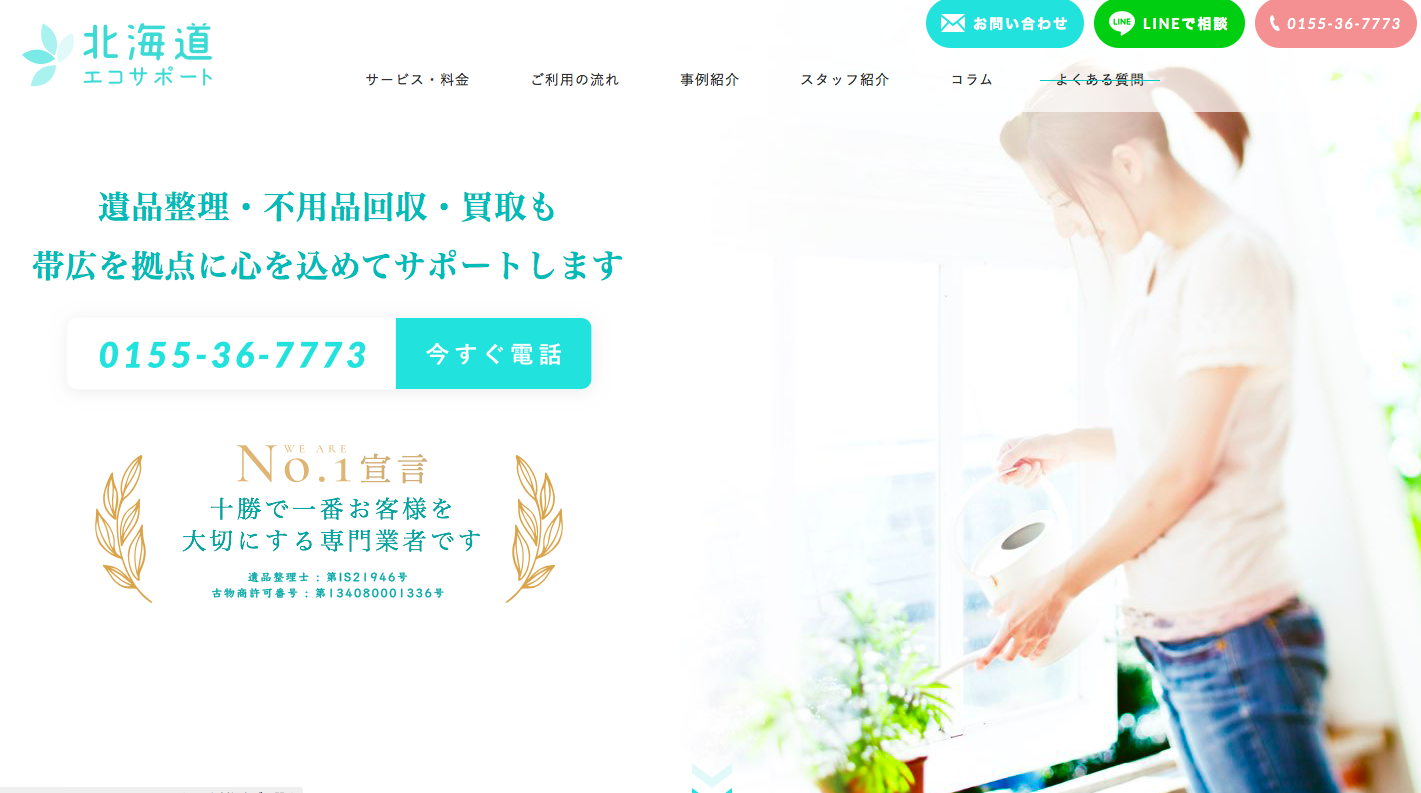 | 北海道エコサポート | 遺品整理定額パック ちょこっとプラン:5,000円 軽トラハーフプラン:11,800円 軽トラプラン:25,800円 平トラックプラン:52,800円 2トントラックプラン:69,800円 2トントラック二台以上プラン:128,000円 | 遺品整備士の資格を持ったプロがいる | 24時間365日対応している | 帯広市をメインに北海道全域 | 遺品整理を始め、不用品回収、出張買取、解体、不動産仲介なども行っている | 遺品供養の記載はありません。 |