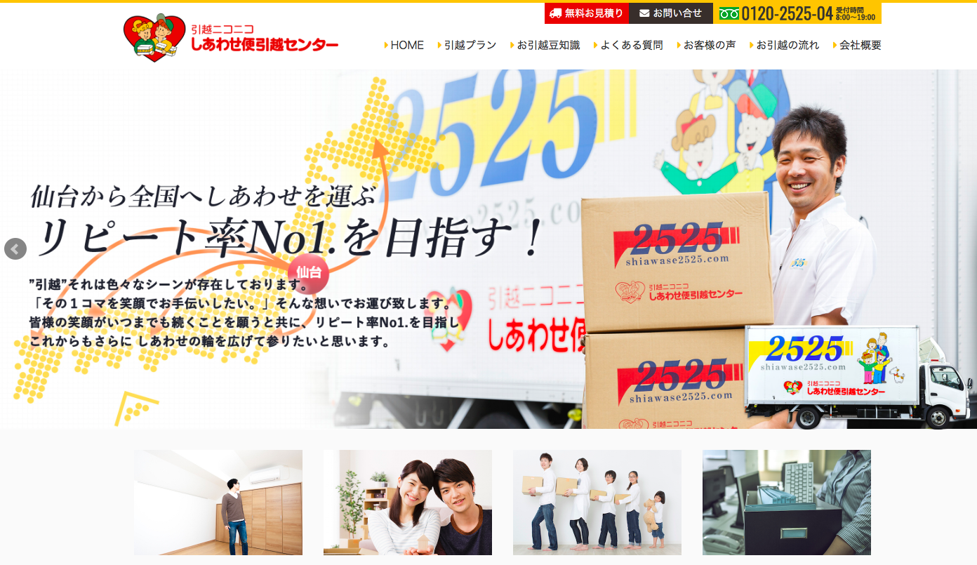 しあわせ便引越しセンター仙台から全国に引越し対応エコノミータイプ、ハッピータイプ、スタンダードタイプ、デラックスタイプといったプラン料金がある写真で見積もりをしてくれたり、自宅から見積もり依頼ができたり便利な業者8時〜19時受付0120-2525-04