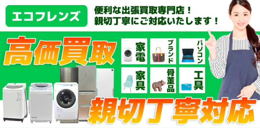 えこフレンズは、家電・家具の買取を特に強化している総合出張買取サービスです。他社で断られがちな冷蔵庫や洗濯機などの生活家電をはじめ、パソコンや自転車など、幅広い商品に対応しています。