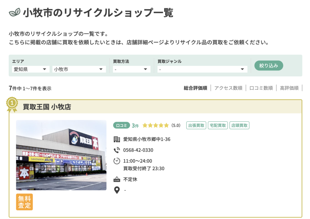リサイクルナビくるくるは小牧市のリサイクルショップ・買取業者の一覧・比較ができるサービスです。出張買取・宅配買取・店頭買取に対応した小牧市内の業者を一覧で確認でき、口コミや営業時間・住所・電話番号まで掲載されているため、地元密着の業者を探したい方に便利なサービスです。