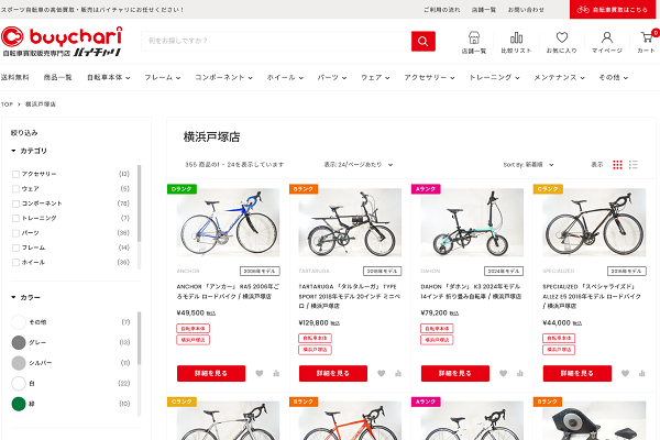 | ビチアモーレ 横浜店 | 自転車高く売れるドットコム 横浜リユースセンター | ロードバイクカウマン サクラス戸塚店 | イープラス | サイクルベースあさひ | |